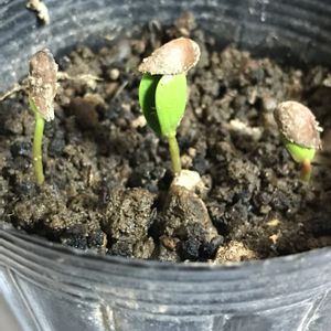 かぶっていたカラがとれて双葉になりました🌱 真ん中の芽だけやたらと生育がいいのはなんでだろう?