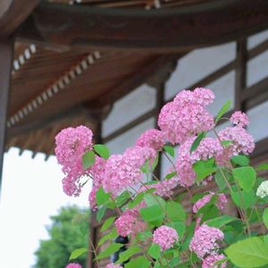 あじさい寺能護寺に 行って来ました 背景にお寺さんを 入れて撮ってみました ピンクアナベルが とても綺麗に咲いてました🌸 🫒🌿🌿20