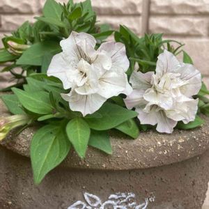 ❇︎栄養系ペチュニアVIVA 八重咲き🤍 この鉢…半額になっていて、、😍 以前この鉢の小さい方しか買えなかったので、嬉しくて… そして、なんとなく気分を明るくしたかったので、 絵と文字の入ってるところを白く塗ってみました…^^(塗り方が雑だけど…💧)