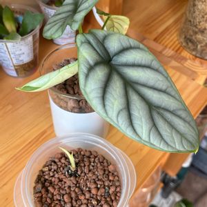 2023/04/01に投稿したシルバードラゴンのその後です。 取り出したイモからの新葉も展開が完了しました🤗 でも、新葉はシルバードラゴンだと言われなければ何の葉かわかりません😅