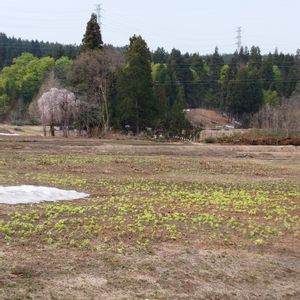 田舎の風景 山、残雪、ふきのとう群生、桜… ふきのとう毎年ながら多い…、聞いて見たらとくに売るためではないそうです