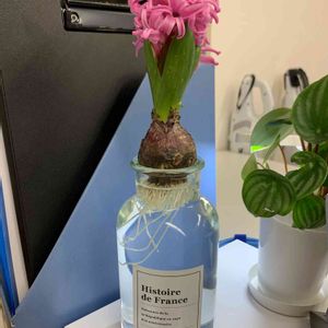 先週慌てて買った芽出し球根 もう花咲いてきた🌸 今年は秋にちゃんと球根買って、きれいな白根を見たいな