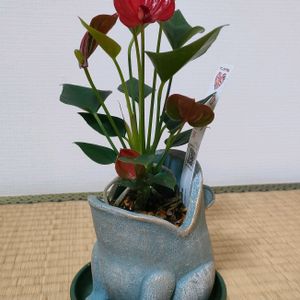アンスリウム 日葵(ひまり)という品種。花も葉も小さくて可愛らしい。 カエルの陶器鉢に植え付け。