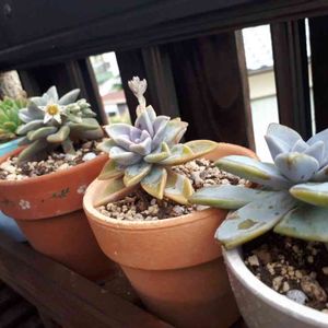 新しい棚に 初恋 桜牡丹 淡雪 マッコスを並べてみました✨ これらは まだ育て始めて数ヶ月ですけど 毎日眺めるのが日課になっています☺️
