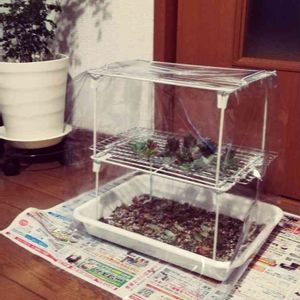 多肉のためにミニミニ温室作ってみました😆 ベランダに置くつもりだけど、軽いのでこの上に重りを乗せる予定です😀 うちのベランダは雨が入るので雨よけがメインです😅 一階は葉刺し。二階は挿し木用。