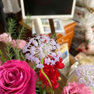 先日家で退職するスタッフさんの送別会をしました😊 テーブルフラワーは秋仕様に作ってもらいました。 小さなブルーレースフラワーがぽわぽわ踊ってるみたい💜 ユーカリの実とルナリアが良い仕事してくれました(*^^*)