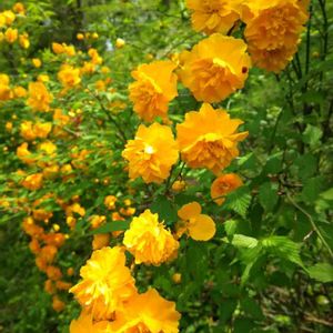 自分の記憶がおかしいのか?っと思うくらい次々と八重山吹が咲いています。 うちの近所の生け垣にも咲いていました。 帰宅後、園芸図鑑を見直したら、やっぱり開花時期は春でした。