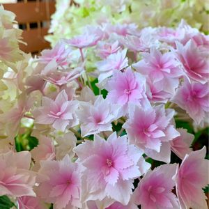 新品種アジサイ パラソルロマン ♡ 栃木県の園芸品種で昨年公開され 今年本格的に販売されたアジサイです。 少し前にお迎えしていたのですが 花傷みがありまた色がまったくのって いない状態でした。 薄いうすーーいグリーンで 何これ😳‼️って感じでしたが やっとここにきて、ピンク色が 入り可愛らしくなってきました💕 そしてグリーンの花弁が白に 変化します。 花弁は尖った形で切れ込みが入り 八重咲きです✨ 優しい感じのアジサイです💓