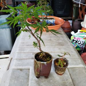 親はたぶん(隣の紅葉)同じと思います。右が弟(妹👧)です😀昨日まで二日間雑草取りしてました。ジャーマンアイリスの葉の下に紅葉出ていて確認したのですが、👴😨実は除草剤撒いてしまいました。直ぐ葉を洗いザルの水苔につかしてました、ラッキーです枯れてなかった見たい、手頃な鉢に植えました。