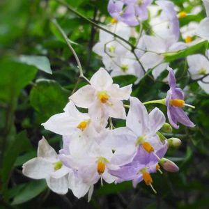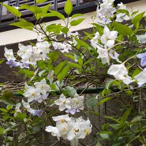 ヤマホロシとツルハナナスの 二つの名前を持つ植物 の園芸品種 のようで、 花は、白色 蔓状にのび、 木化した茎、 もちろん宿根です。 まだ、花の後に実を付けたことは、ありません。