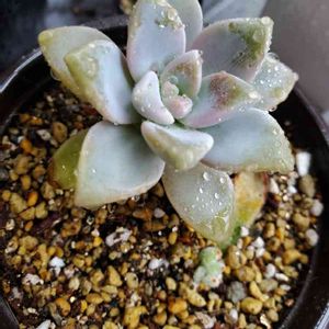 水滴がつく植物ってなんか、魅力的。 軒下のベランダ。 太陽光が少ない雨の日。 霧吹きであげてみた。 月兎耳のおちびさんは鉢を間借り中。