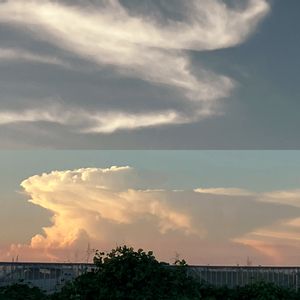 夕方散歩🚶♀️ 空の雲が もう降るしかないヨ ネ 積乱雲 じゃないの 上の白い🤍雲☁️何かな? 雨待ちの私 木々 草花🪴 手前の黒いシルエットは葛です♪