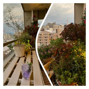 お疲れさま! ジン(オリジナルインディゴ) ミントを入れた ソーダ割り ベランダ飲みが最高の季節になりました。 突っ張り柱に誘引したブーゲンビリアは 今が盛りと 元気です。 ソフォラも元気!すこしづつ成長しています。