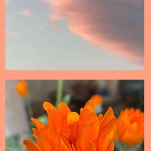 こんばんは😊♬ 夕飯のおかず足りなくて、スーパーに寄った駐車場での空pic🧡✨ キュンとする空🧡✨ 帰宅時に、玄関先でこのサフィニアさん💖が撮って❣️撮って❣️と言うので🤗 1枚🤳😆 日々草✨この子はきっとピンク色💗が咲きそうです♬ほんのり赤い💕 零れ種では初のピンク色💗 ガーベラさん✨も明日咲くかな🎶