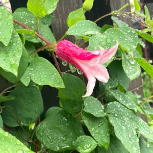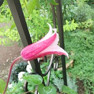 随分と雨脚も弱まっていますが雨のGW最終日🍀 雨の中でも花は次々と開いています。 ꕤ︎︎·͜· ︎︎ クレマチス エールフクシマ チューリップ咲きでローズレッドの明るい花を横向きに咲かせてくれます。 回転させたらチューリップにそっくり🌷 小雨なので傘も差さずに超特急で庭パト💨 気温も低く、雨に濡れ身体は冷えきってしまいました😅 良い子の皆さんは真似しないでね🤭