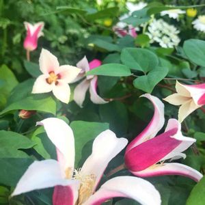 クレマチス エールフクシマ 母の日に送って可愛い〜と思ってたら我が家にもやってきました✨ 咲き始めは壺型、開くとチューリップのようです🌷 内側の白と外側のピンク!派手すぎないのに目を引く色合いで可愛い💕咲き進むと外側の色が濃くなっていくようで一株でグラデーションが楽しめる不思議なクレマチスです😊