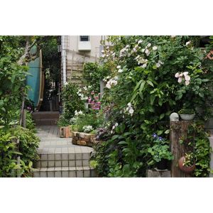 ◆いつもの箱庭 箱庭に入った階段の下から玄関前のポーチを見上げると、咲き始めた緑光とスパニッシュビューティ(バラ)が...
