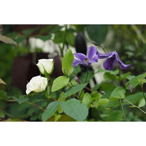 ◆クレマチスとバラ 箱庭のバラは蔓バラや、鉢植えがそのまま地面に根が張って動かせなくったバラなどで、鉢植えとは言え移動させることは出来ません。 一方でクレマチスはと言うと、これもまた全て鉢植え... しかしこちらは強剪定のタイプばかりなので、仕立て方によっては移動は自由なのです!! 上手いことにリトルボーイは、木立性と言うことで鉢の移動は自由な訳で、緑光の隣...鉢一つ分開けて置いてあったのですが、間に置いてあった鉢と入れ替えて、ピッタリと寄り添ってもらいました!! 箱庭ならでは反則技ですが、これもまた箱庭流!!