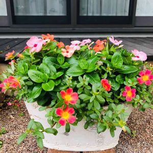 こんにちは今日も蒸し暑いです〜😂 雨雲がいて今にも振り出しそうな感じ〜☁️ リビング前の日日草にポーチュラカの寄せ植えちゃん🌺🌱
