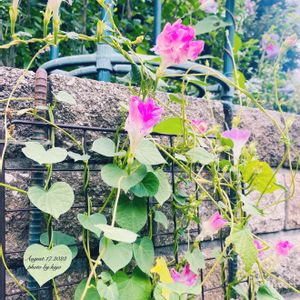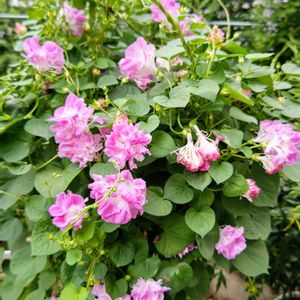小さな鉢で育てていた変わり咲きのアサガオを1ヶ月前につるバラの足元へ地植えにしてみました。 上に絡みながらつるが伸びているのですが今更ながら摘芯をしてみました。 脇からもっとつるを伸ばしたいです🌱🌱 よく見ると小さな蕾がいくつもありました❤️