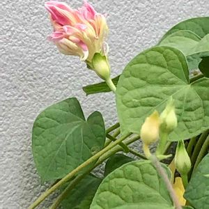 何なに👀 もらった種を蒔いたの忘れてた😅 どんどんツルが伸びてアイスクリームみたいな蕾💕 アサガオだって言ってたけど 葉っぱが違う気がする🤔 これが開くのか? 楽しみ~😁🎶 名前が分かる方いらっしゃいましたら よろしくお願いします🙇♀️ ”スプリットペタル”だと教えていただきました とても可愛いお花が咲きそうです ありがとうございました(❁ᴗ͈ˬᴗ͈))