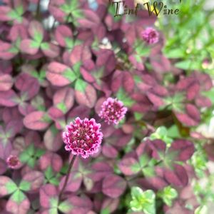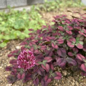 クローバー・ティントワイン 少々お疲れ気味です😥 もしゃもしゃで纏まりが無いです💦 赤みの濃い美しい葉に緑色⸜❤️⸝☘️ 丸いお花が可愛らしいです💗 蒸し暑さに負けないで欲しい‼️