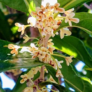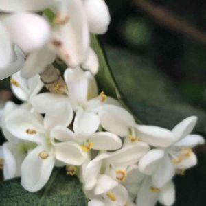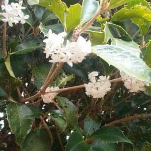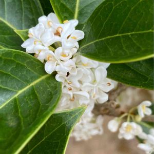 お出かけ先で出会った、銀木犀の花🍀 皆さんのpicを拝見して、ずっと見たかったギンモクセイの花😄 綺麗な緑の葉に、真っ白なお花が映えますね💕 どんな匂いだろうと、嗅いでみると金木犀に、沈丁花の香りを足したような、とても芳しい香りでした😊💕 会いたい人に会えたような嬉しさ💕 銀木犀さんとの出会いでした😊💕🍀