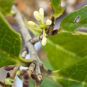 ギンモクセイ (モクセイ科モクセイ属) 似ているお花はキンモクセイやヒイラギモクセイがありますが キンモクセイは見た目でもお花がオレンジ色🧡なので すぐ区別できますが ヒイラギモクセイはお花も白く🤍 どちらの葉っぱにもトゲがありますが ギンモクセイは遠目からでは見えないくらい小さいのに対しヒイラギモクセイははっきりわかる大きさです またヒイラギモクセイは枝にくっつくようにお花が咲き雄しべが長く発達しているようです ヒイラギモクセイの香りはキンモクセイに似ているようですが甘ったるくない香りだそうです ギンモクセイは近くに行かないとかおりを感じないです