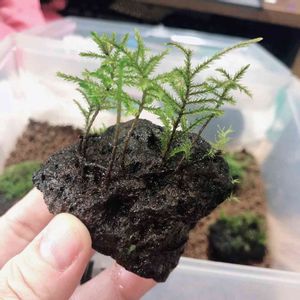 溶岩着生のコウヤノマンネングサ留めてたゴム取り除いたけどちゃんと根付いてるー!嬉しい! 1本だけ生えてる地下茎をぐるっと巻いたんだけどニョキニョキ生えてきて笑う