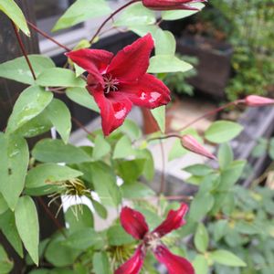 クレマチスがよく咲いてくれてます(^ω^) 赤色は庭の緑に映えてきれいですね(´-`*)