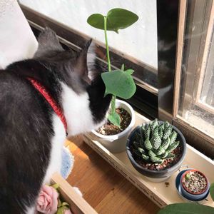 夏に 枯れそうだった ミニチュアローズの盆栽仕立て🌹 2つ目の蕾みが つきました🙌 小指の爪ぐらいの大きさです🥰 グレ子は 匂いを嗅いで 食べ物かどうか 確認😸