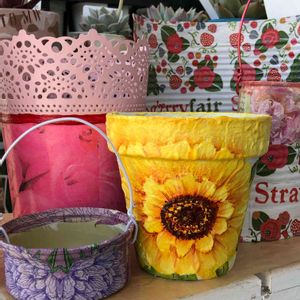 トワさんから素敵便が届きました~🎵✨ なんと、GSでよく見かけて素敵だなと思っていた、トワさん作のリメ鉢やリメ缶が6つも‼️😃 アンビリーバボー😆🎶 ペコちゃん祭りやフクロウ祭り等、いろいろ参加できそうです。😄🎶 大切に使わせていただきますね。😌♥️ トワさん、ありがとうございました。🙇💕 過日古花市で、スワッグとしてお迎えしたドライフラワーを添えて。✨ 頑張ろう❗日本‼️ 👊✨