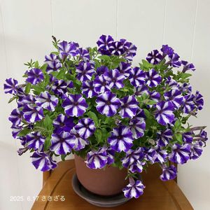 🌼お花便り カインズさんxPWさんコラボ 【#あふれ咲きペチュニアブルーベリージャム 】 🗓️ 2025-4/12 → 2025-8/26 (18w3d) 🧭南西 ☀️3時間(遮光無し青空管理) 🪴8号1株 🚿朝1回 🧴液肥週1 過去2年📌④⑤最後に徒長してしまうという試練に鍛えられ🐒💦「石の上にも3年」念願の満開です*٩( ᐛ )و ちょっと傷んだお花もあるし あちらと こちらと そちらに スキマがちょいちょいあるけれど💦私的には満開💯です✨ 🐵PWさん3年連続で苗(教材🌱)を頂いてやっと沢山咲いてくれとても嬉しいです✨有難うございましたm(._.)m #pwスーパーアンバサダー2025 春で頂きました #あふれ咲ペチュニア #ペチュニア 🐵日本中猛暑🥵でお花沢山枯れちゃったって投稿を目にするんだけど…うちそんなに枯れていないんだよねなんでだろ🙄 って考えてみたら数年前からここ愛知は40℃近い日が多くあるエリアだったから慣れてるんだろうね(慣れたくはない)🙈昨日のニュースで昨年の猛暑日は47日あったらしく今年はまだ10日くらい少ないと言っていたよ🐵 みんなさん今年の猛暑で沢山枯らしてしまったかもしれないけれど「お花育て諦めなくても」「好きなお花にチャレンジしても」大丈夫だよ🙆🏻‍♀️ と高温エリア愛知☀️からお伝えさせて頂きます🐒🌱