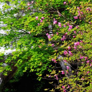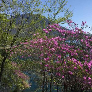 トウゴクミツバツツジ 20.5.28 日光竜頭の滝に一番似合うツツジ💠 滝の上では七分咲🏵下ではほぼ満開のよう☺️ 日光は昨秋の台風💨今年コロナの被害😖 それでも綺麗に咲いています🤗