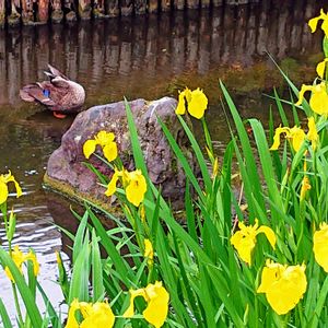 今日の散歩🚶♂️ 一之江境川親水公園⛲ キショウブ🌿と鴨🦆