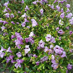 スーパートレニアカタリーナ ピンクリバー 挿し木をして鉢とプランターに植えて友達にもあげて 残った何本かを花壇に植えたらこんなことに❗ 他のお花を覆ってしまい ブロックを越え細い通路もふさごうとしています まあかわいいからいいよ~😅