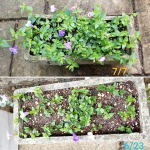 玄関用の鉢W35cm 高い所に置きます 今年はスーパートレニア カタリーナを😊下6/23 上7/7(本日) 6/12植えつけ時に中央にピンクリバー1ポット、それ以外は全て挿し芽っこ🙋 ピンク、ブルー、アイスの3色をまぜてみました😆 どんなになるかなあ。