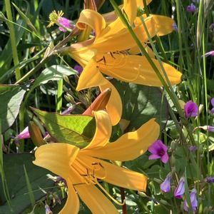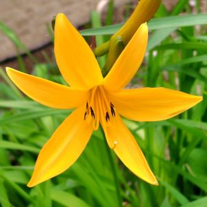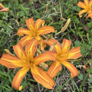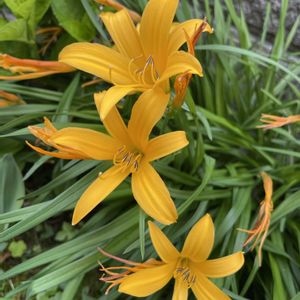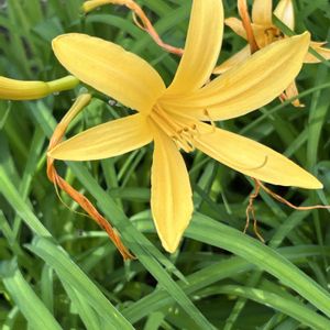 ヒメカンゾウ ・明るい黄橙 目立ちます❣️ ・アップで 朝咲いて夕方には、萎んでしまう 一日花 でも一つの花茎に蕾がいくつかあ るから次々と咲きます😊 今日は、午後から雨☂️みたい 雨が降り出す前に草取りしました
