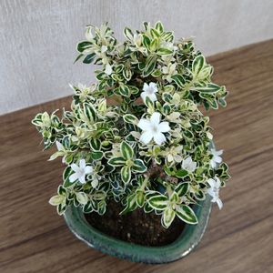 斑入り白丁花 (フイリハクチョウゲ) 寿命10年と言われている白丁花の新芽を挿して、 1年生を作りました😆 何か白い物が枝に付いていたので、 指でつまんでみたら、 パチッとはじけて、 花が開きました😳 蕾だったんですよ〜〜🤍 信じられナ〜〜イ😶 いつも2日くらい咲いてくれるのですが、人力で開かせてしまったので、すぐに散ってしまうかと思いました💦 でも、次の日も咲いてくれました🤍😊 白いお星さまの形の清純なお花🤍 GSでもupなさる方が多いですね。 花言葉は、「純愛」ですよ😆