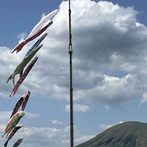 鯉のぼり🎏 阿蘇の草原で見事に 高々泳ぐ、鯉のぼりに、出会いました、 何とクレーン🏗️の先に‼️ 今日は、こどもの日🎏