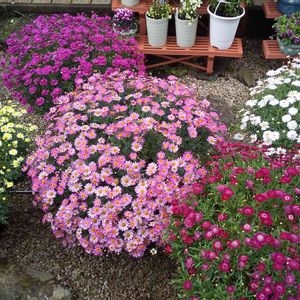 オステオスペルマム… 呪文みたいな名前ですが美しい。 昨年秋より迎えて沢山咲いてます! サントリーキララ、イエローホワイトの混植です。