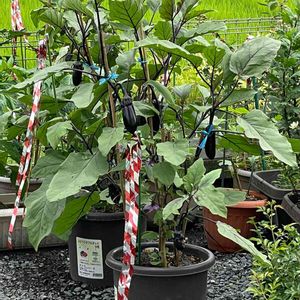茄子🍆が実ってきてます😆 明朝に収穫したいけど、カラスが心配で…😮💨 こちらにも、キラキラてーぷを垂らし… 風が無いですわ…😑