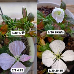 おはようございます👋😃 昨日の、月見草の観察です。 ↖️17時45分 ↗️19時 ↘️19時45分 ↙️今朝3時50分の色の変化です。 途中が少ない😅 今日に限って、朝まで爆睡😪💣️💤 ごめんなさい🙏💦💦 でも、酔芙蓉の夜バージョンのような色の変化が見えました😊 後、蕾は3つ。またできれば観察して報告したいです😁