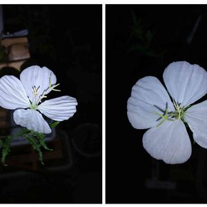 2023年8月3日、午後9時半頃。 月見草🤍 一つのお花の咲き始めをコラージュしました。🥰 暑さ🥵のせいか、咲きにくくなってたので、開いてあげたら、やっと開いたけど、花びらがそり返ってグタっとしてました。🥺😩 こんな花びら初めてです。😳 かわいそう🥺