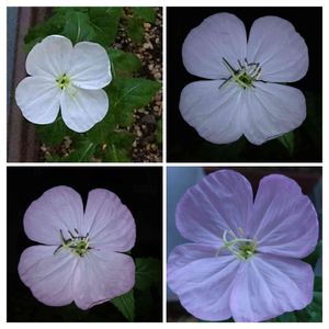 2つ目のプランターの月見草、お花の色の変化です。🥰 上左、6月23日19時26分。上右、22時49分。 左下、6月24日2時02分。下右、同4時58分。