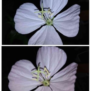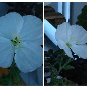 月見草🤍😍 19時41分、 パッチリ開きました。🥰 そのまま撮るのは同じになるので、ちょっと角度を変えて撮って、コラージュしてみました。🥰 真横から撮るととても神秘的に見えます。😳 辺りが暗くなってるとフラッシュが光るので、白さが際立ってます。🤍🤍 それに、雄しべ雌しべって、こんなに長さ違うんですね。改めて見ました。😂😂