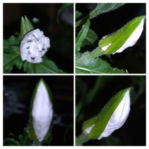 月見草🤍🩷 右上から時計回りの順番です。😊 なんと、もううっすらピンクになってました。😳 もしかしたら、今日は暑かったので、さやが硬くて花びらが出て来れないのかもしれないと思い、優しくさやを外してあげたら、ちょっと開きかけてきました。😁左上です。 このあと、キレイに花びらが開いてくれるでしょうか??🤔 寝たいのに、寝れません。😂
