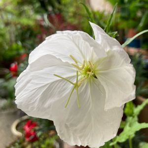昨日咲いた月見草が赤くしぼんでるその前で、今、咲き始めた真っ白の月見草を撮りました。🥰 PM6時25分です。 いつもはベランダに出してるプランターですが、撮るために、部屋に入れています。😁