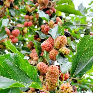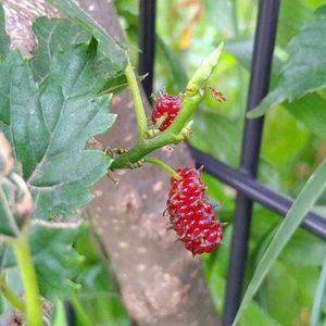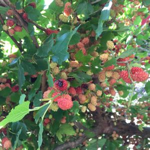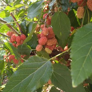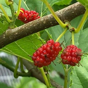 裏庭の桑の実が熟してきました🧡 つぶつぶと、トゲトゲのアピールが半端なーい❣️ 黒っぽくなったら食べられるのかな⁉️