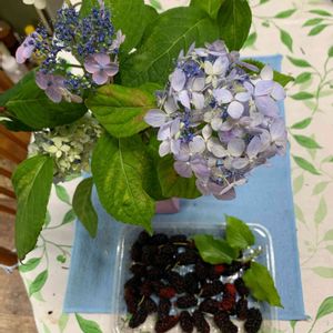 桑の実は、家にある今朝鉢植えの木から、収穫。何回めかな?あと2〜3回は、採れるかな? 昨日は、妹の倉庫前にある木から、採ってきました。もうちょっと遅い。一昨年は、たくさん収穫、昨年は、虫にやられたとかでダメ。木は、半分くらいの大きさになっていました。その方が採りやすかった。 その近くにアジサイが咲いていたので、頂いてきました。このくらいの大きさもかわいい。山アジサイかしら?
